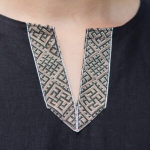 Рубашка из чёрного льна, отделка жаккардовой тесьмой с узором «Одолень Трава».
